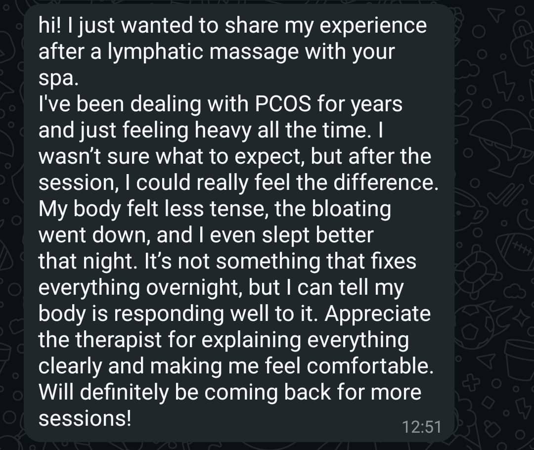 Many of our clients with PCOS have noticed a difference after just a few sessions. They’ve shared how they feel less bloated, more relaxed, and lighter overall. While lymphatic massage isn’t a cure for PCOS, it’s a gentle, natural way to support your body and ease discomfort.